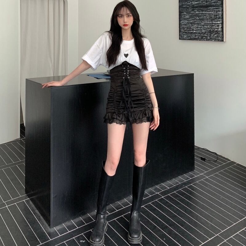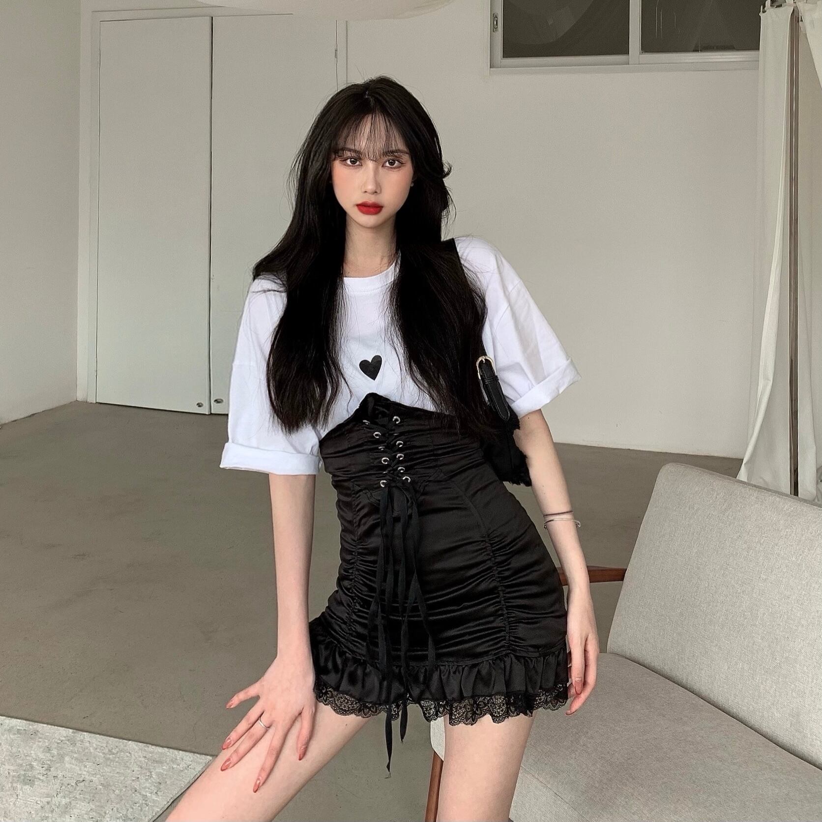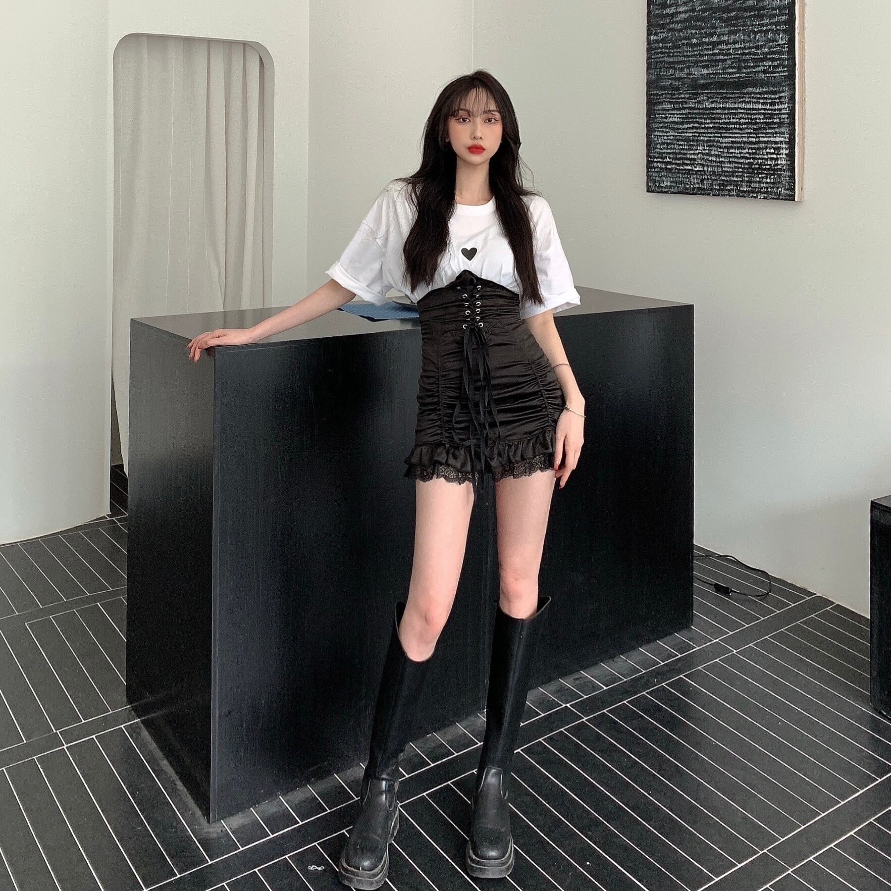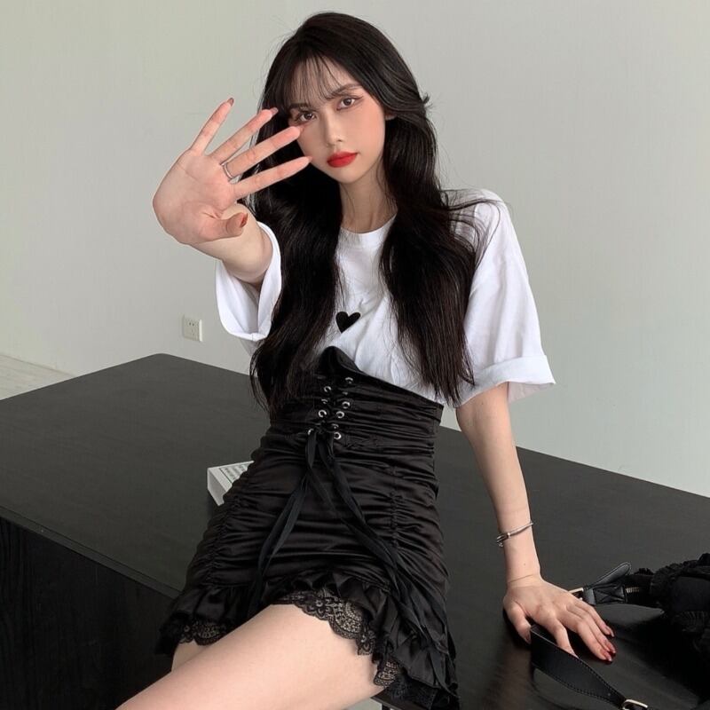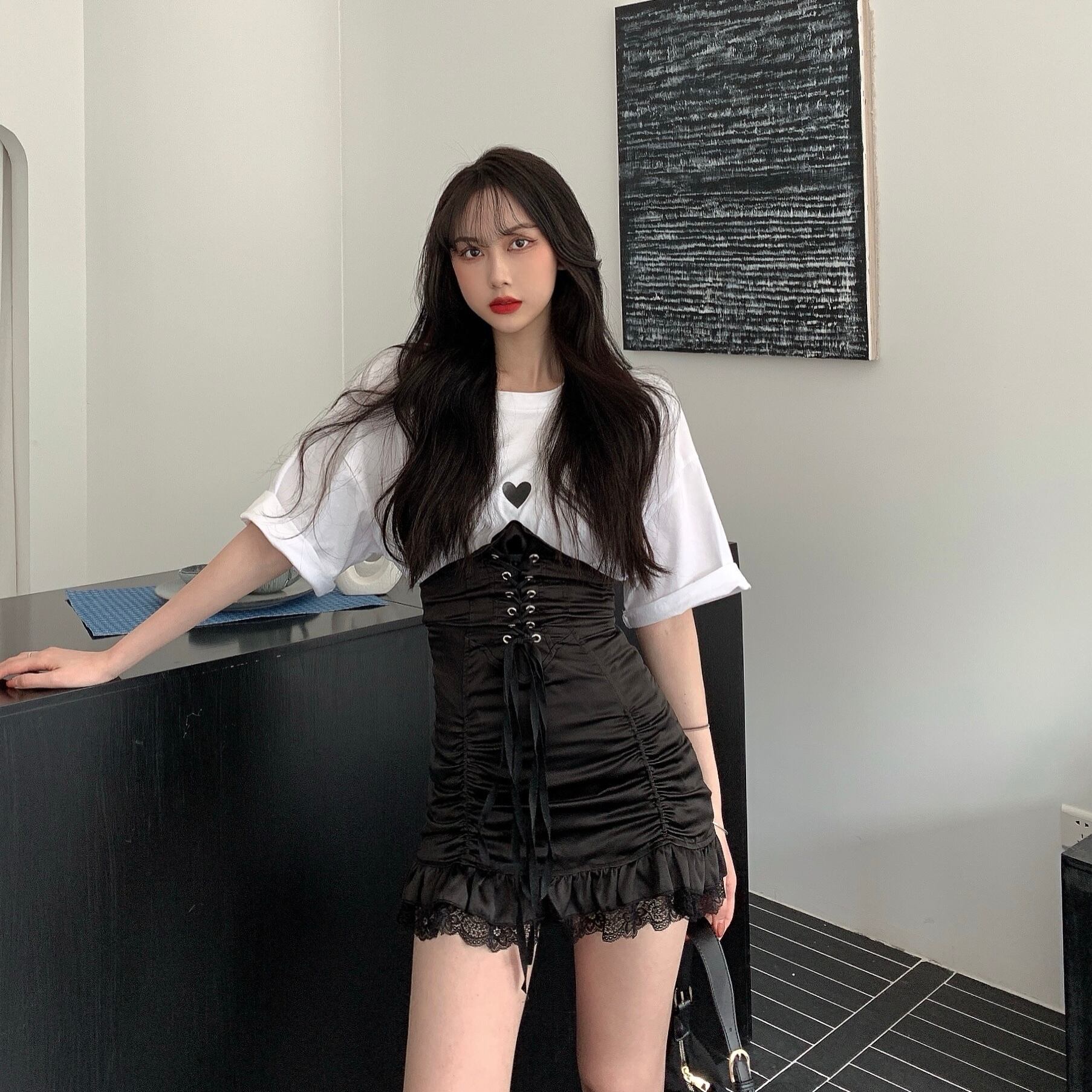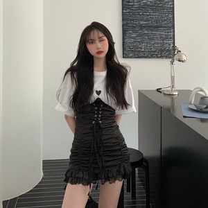 オータムプリントTシャツ スタンダードハイウェストレーススカート レトロ 秋物 ステッチ YY-ファッション72258942772