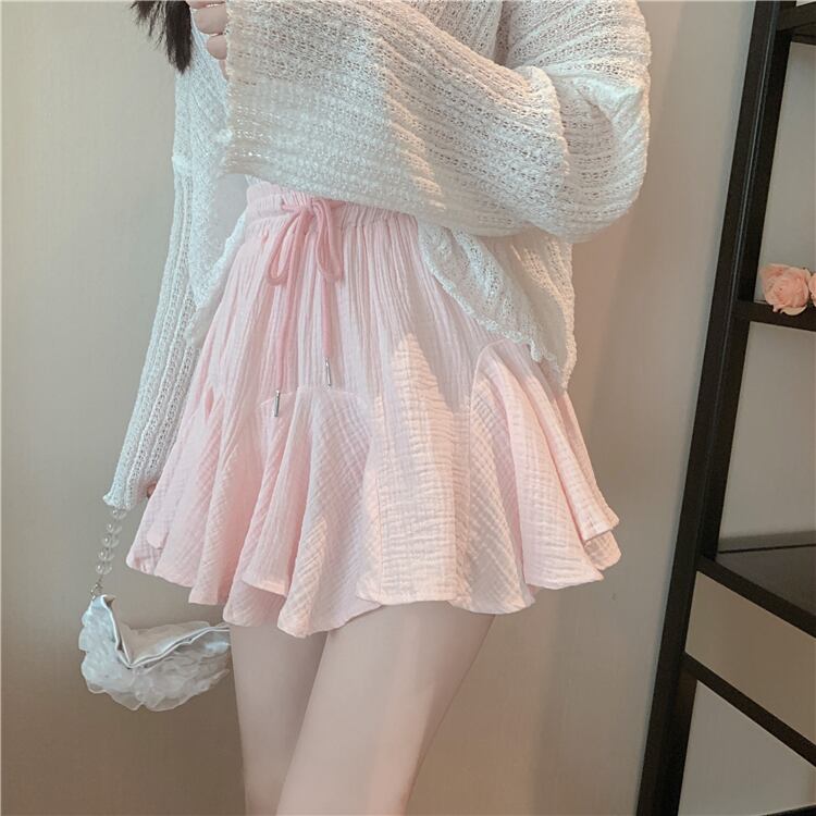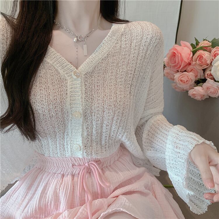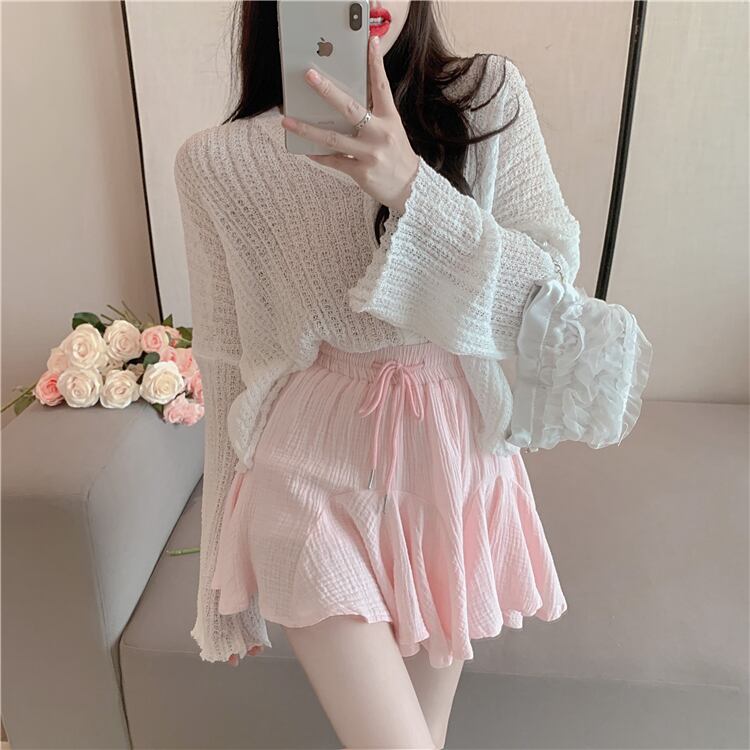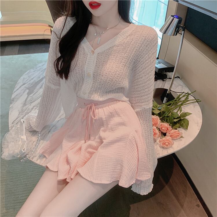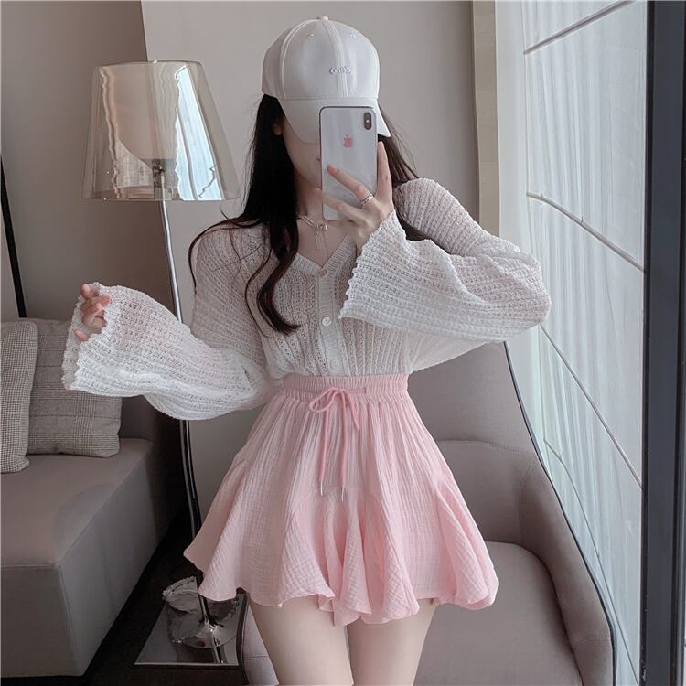 色:白いカーディガン,ピンクのスカート