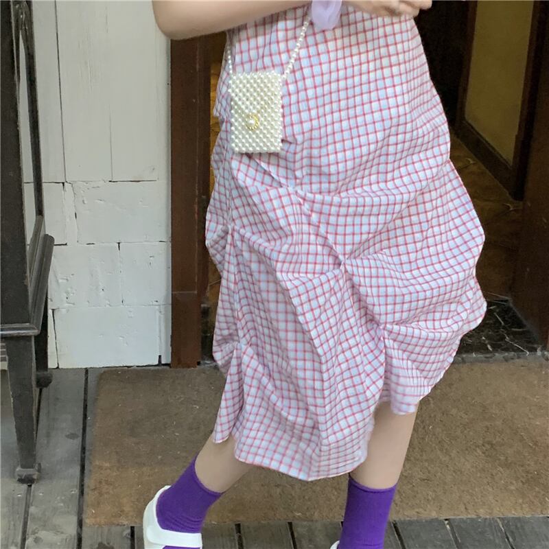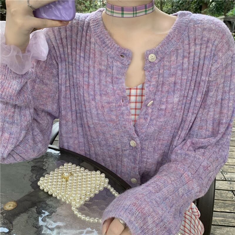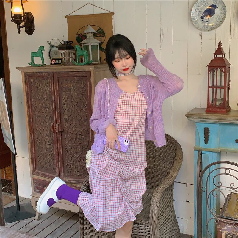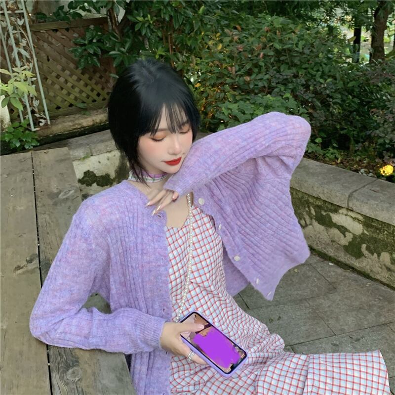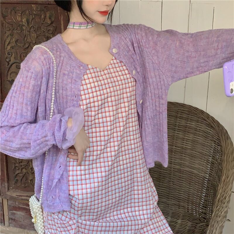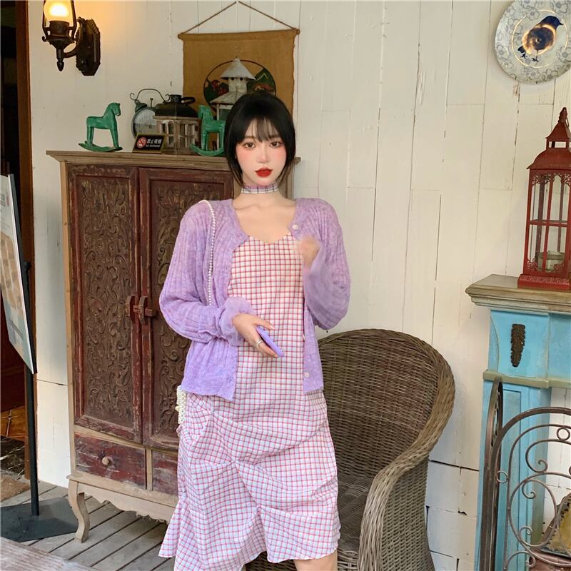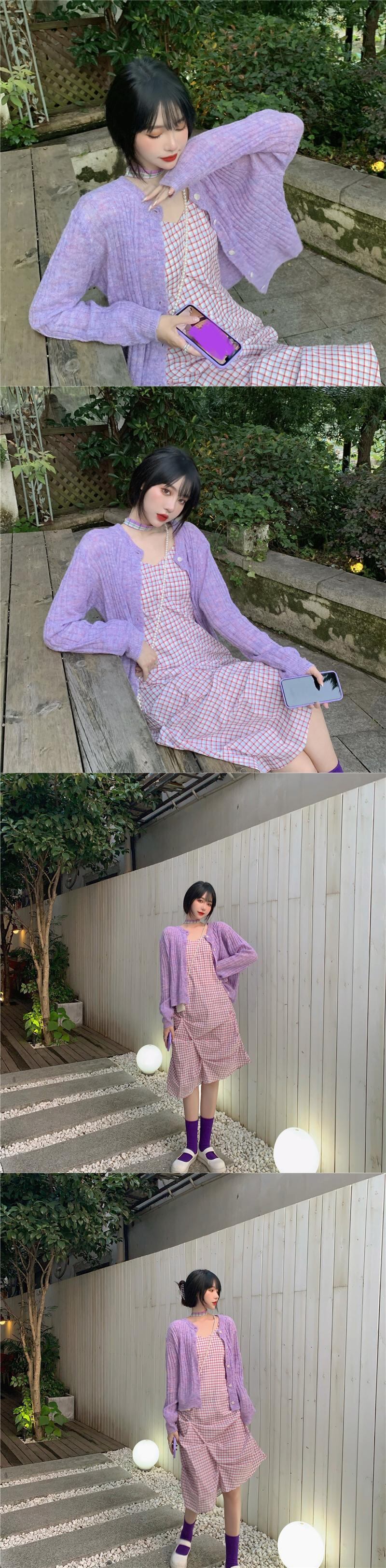 色:クリームパープルカーディガン,チェック柄ホルタースカート