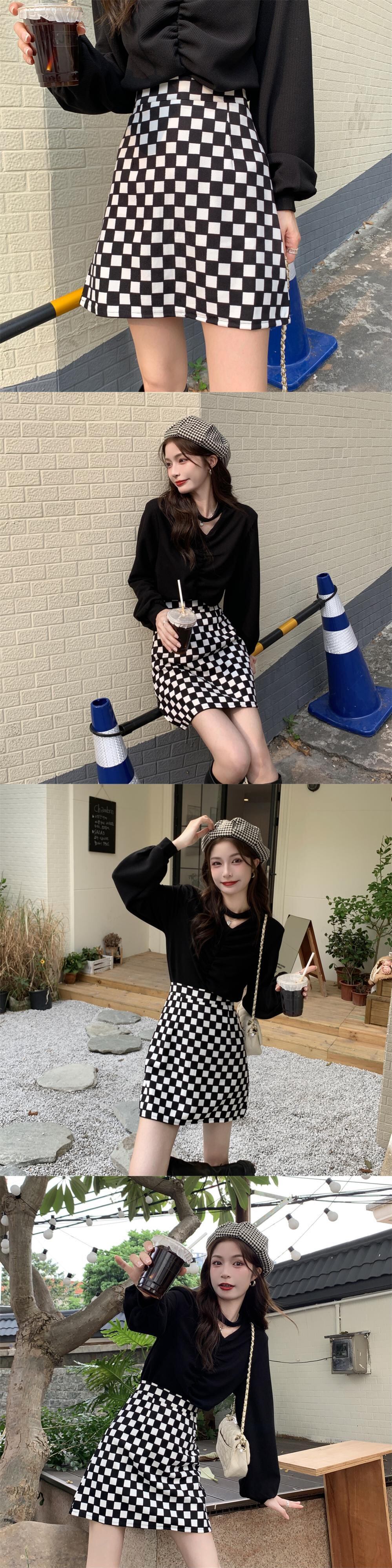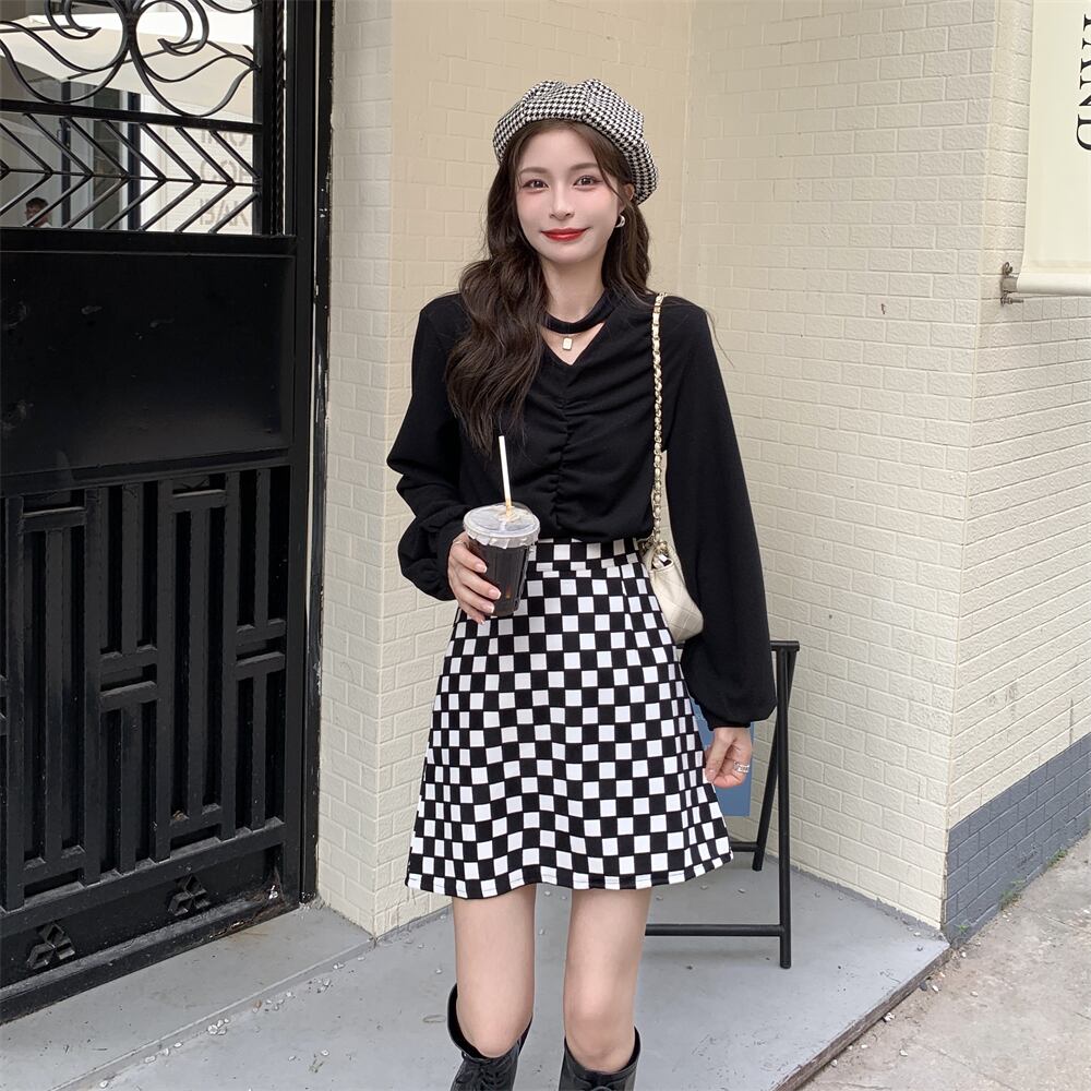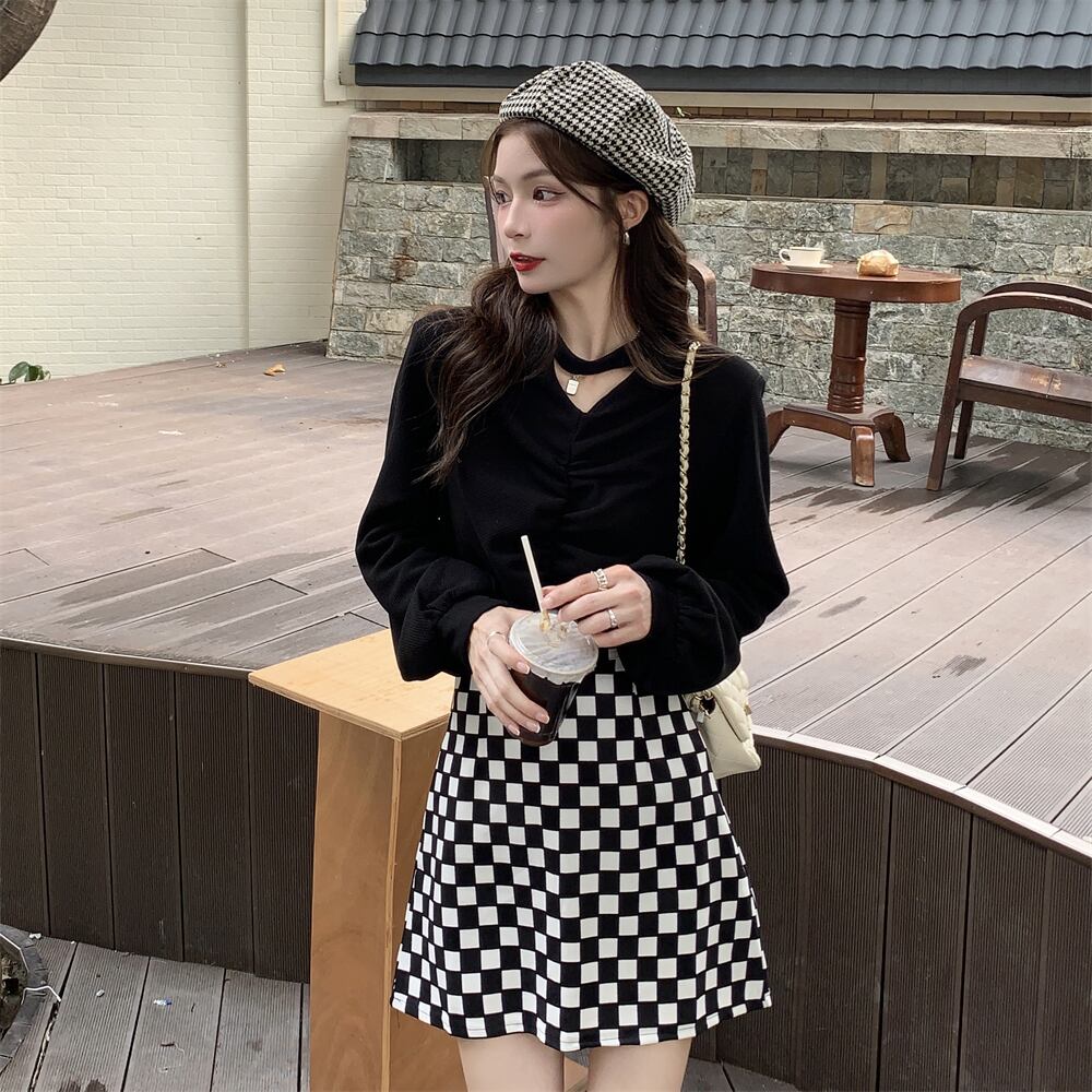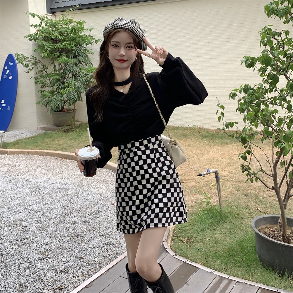 色:黒いセーター,チェッカーボードスカート