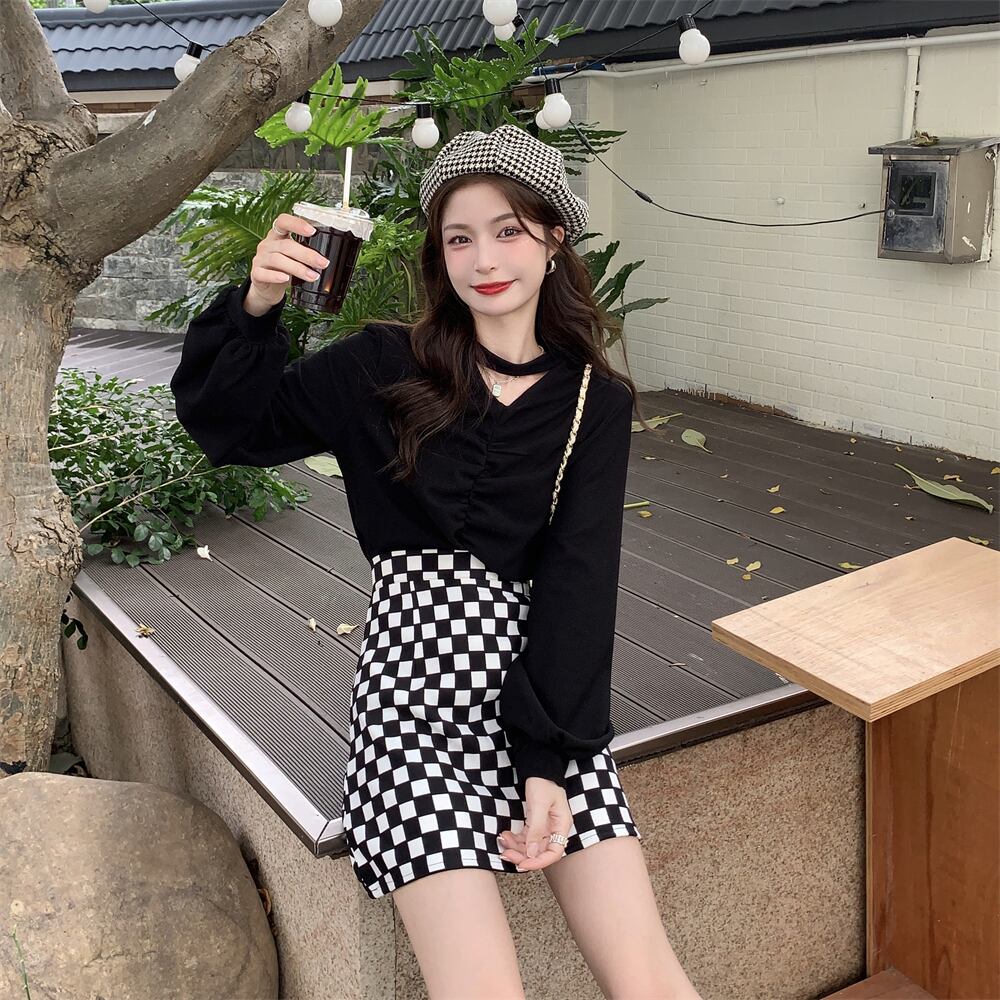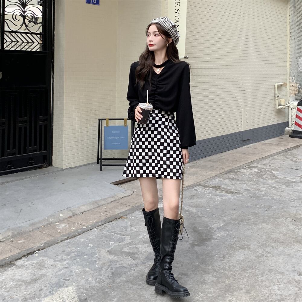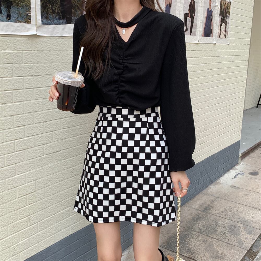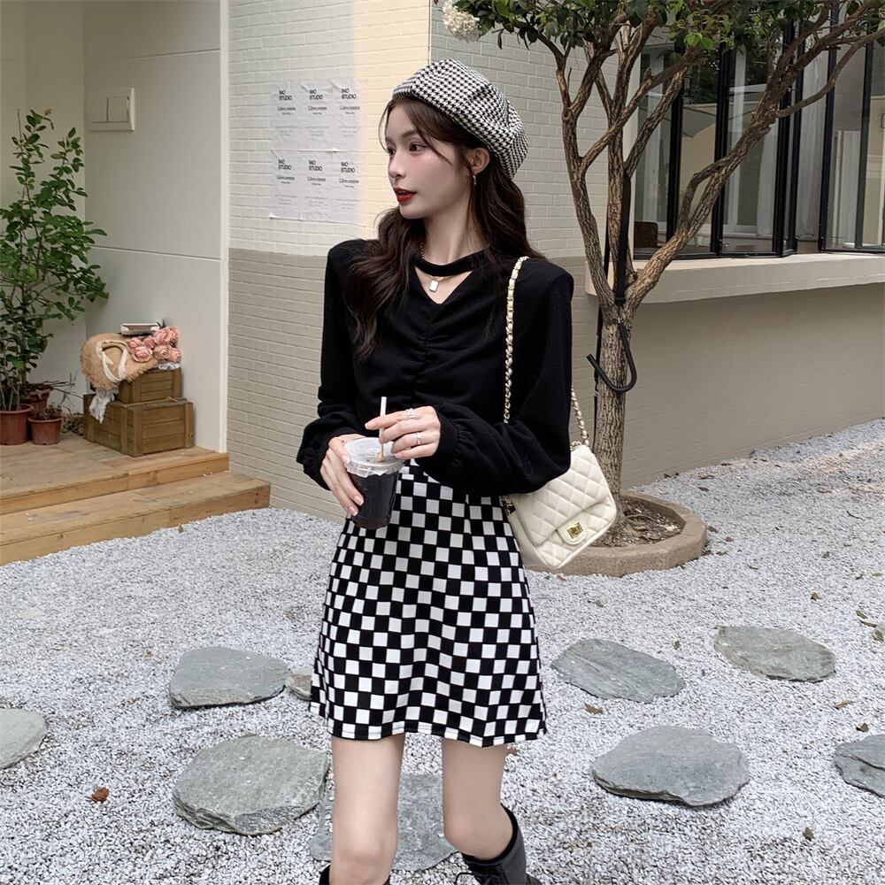 色:黒いセーター,チェッカーボードスカート