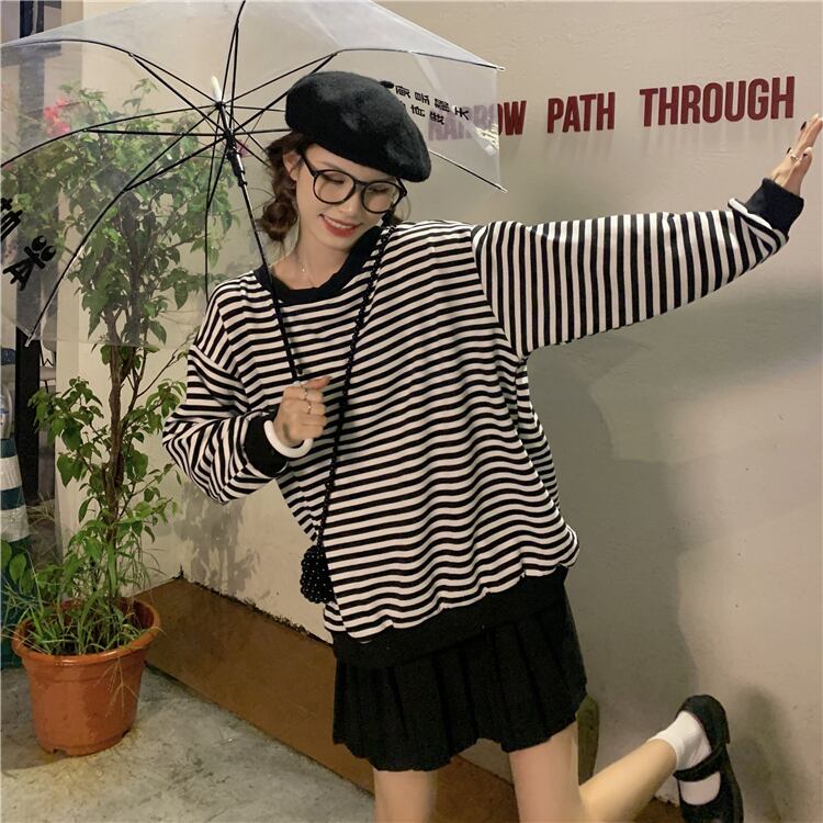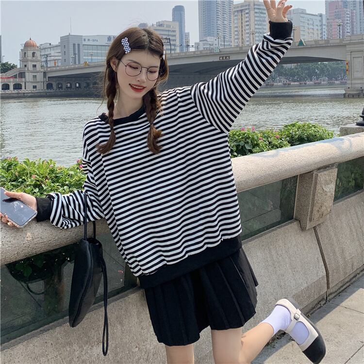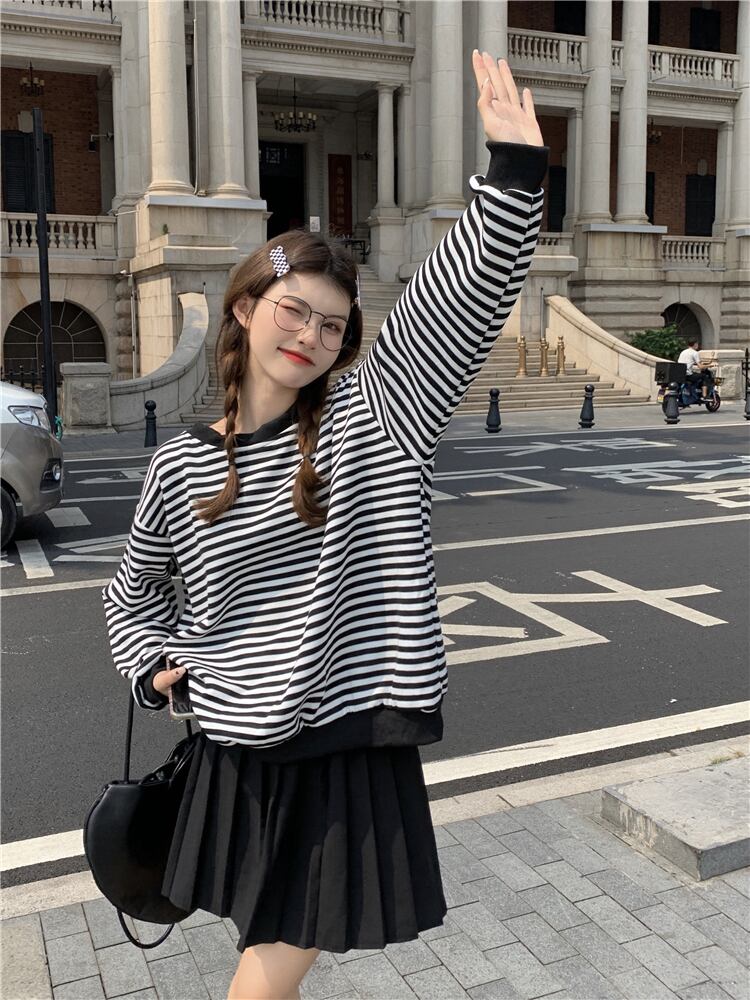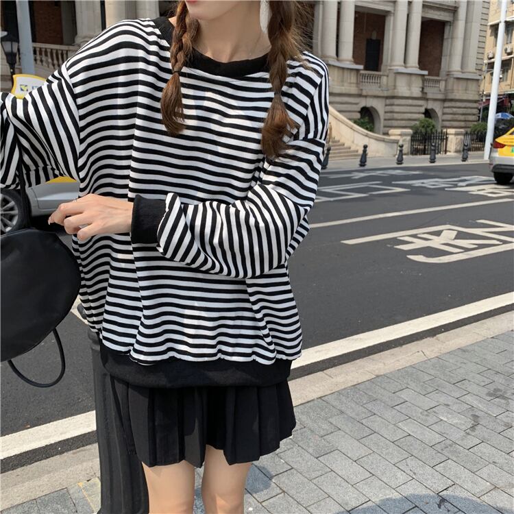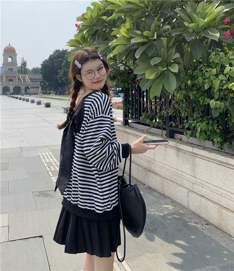 ブラックホワイトストライプセーター レディースオータムルーズ薄手リボンシャツ ロング 秋物 YY-ファッション85034612986