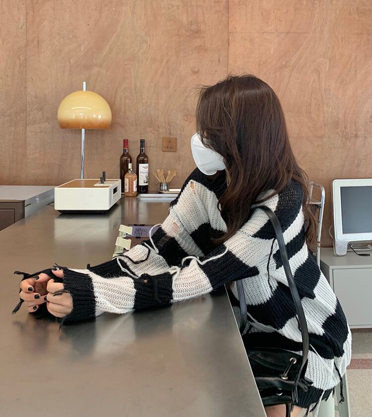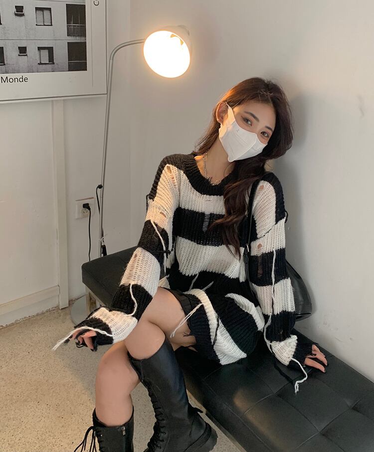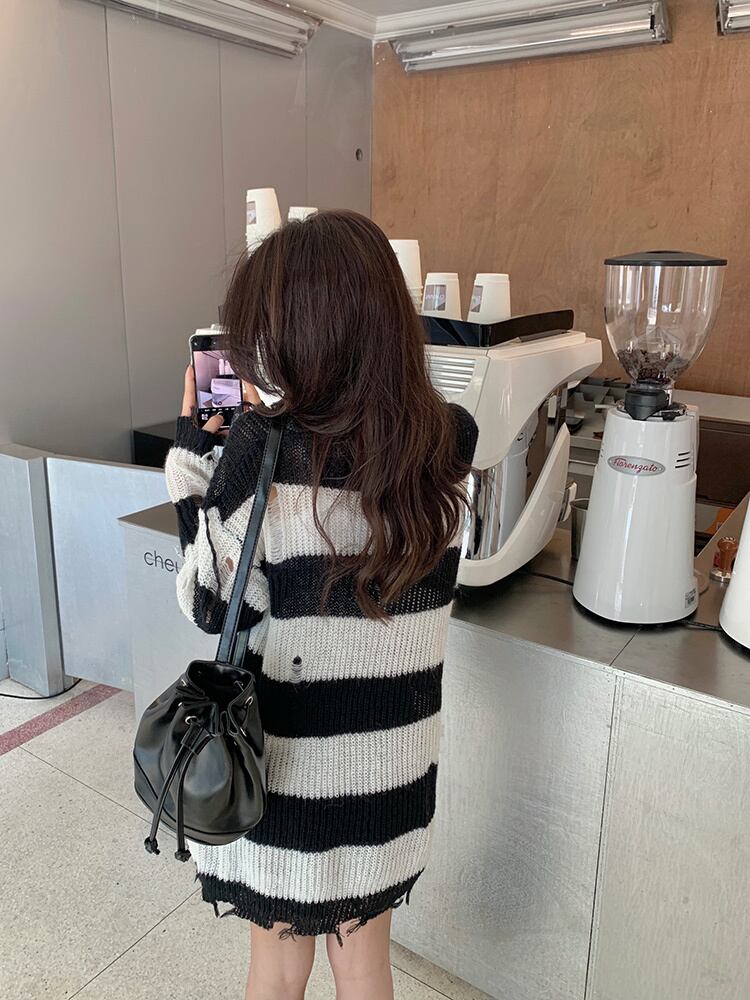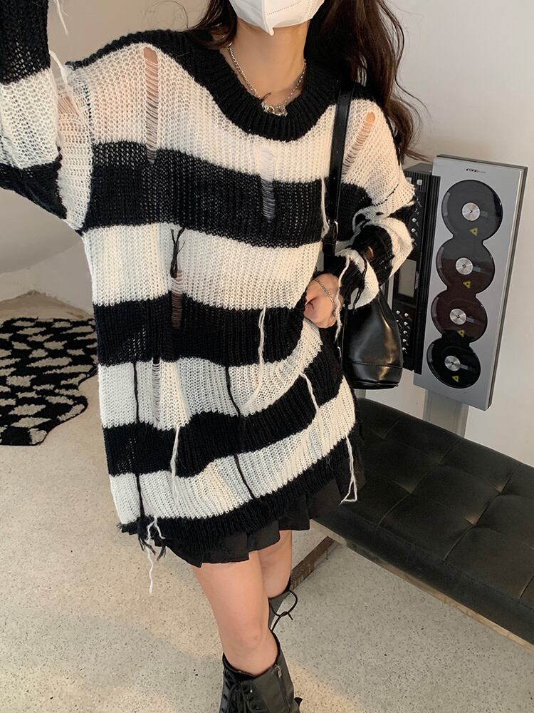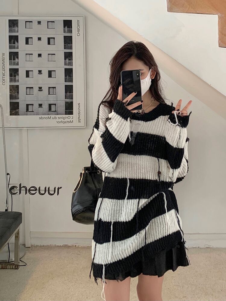 オータムブラックホワイトストライプセーター ルーズニットトップス ロング 秋物 YY-ファッション71305728044