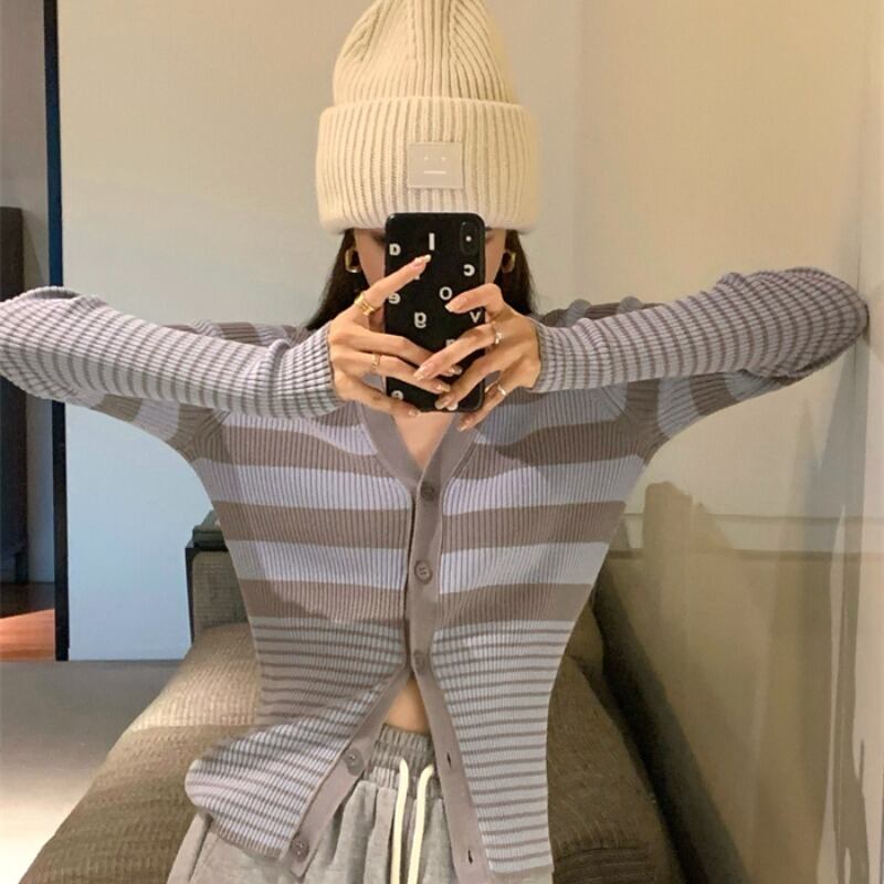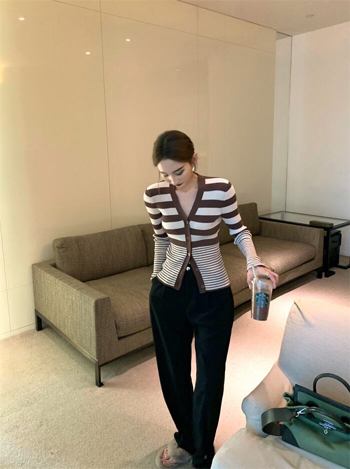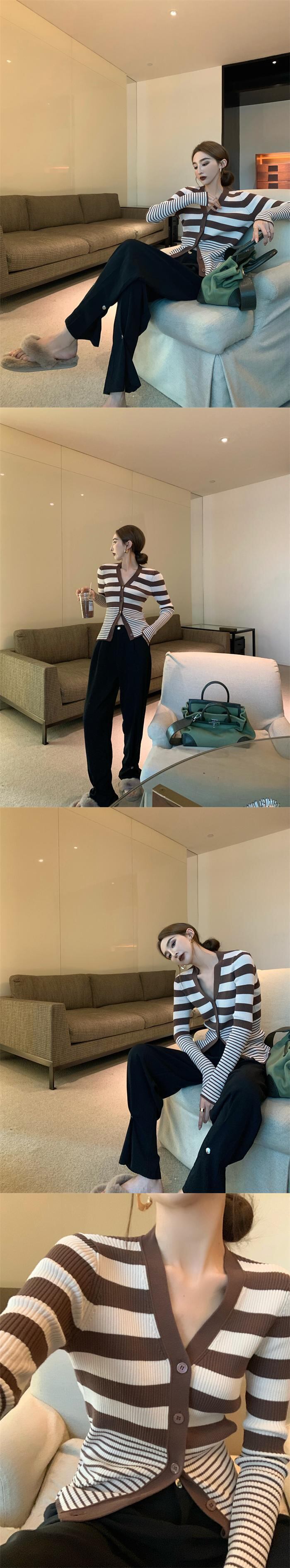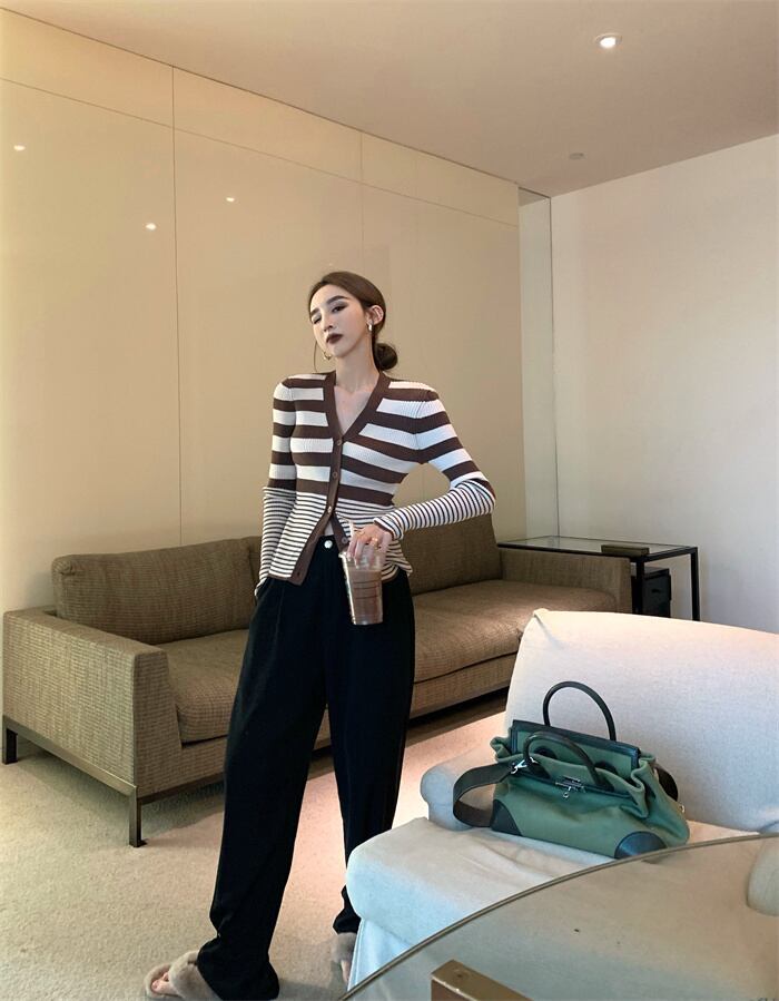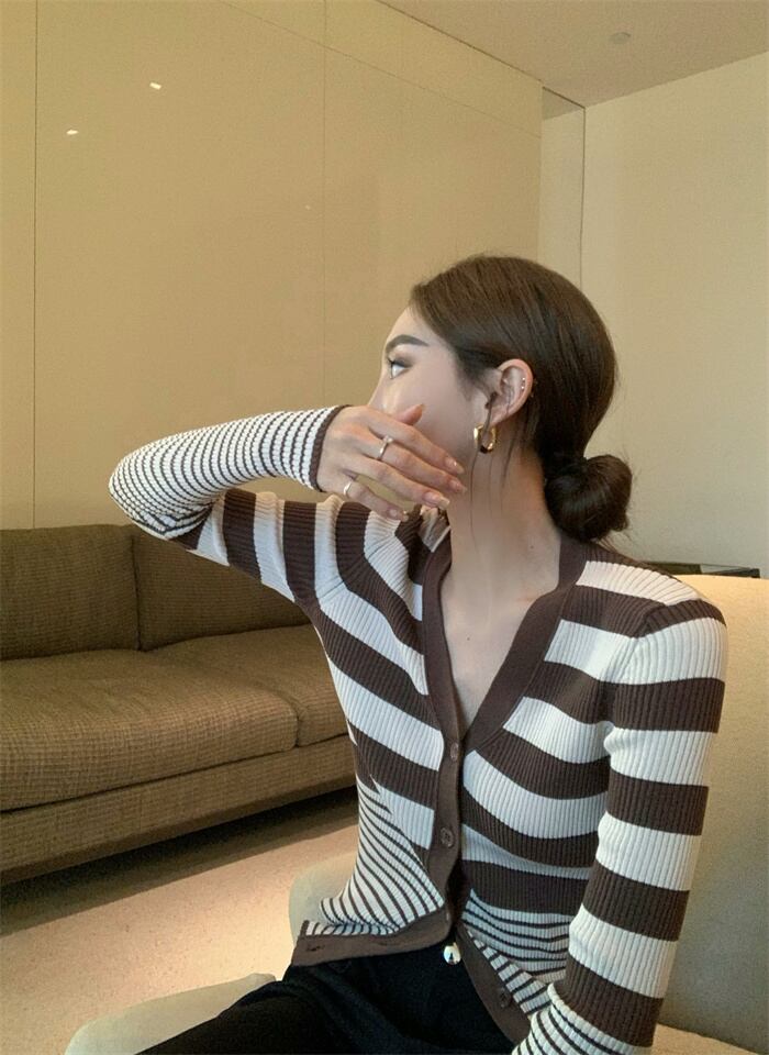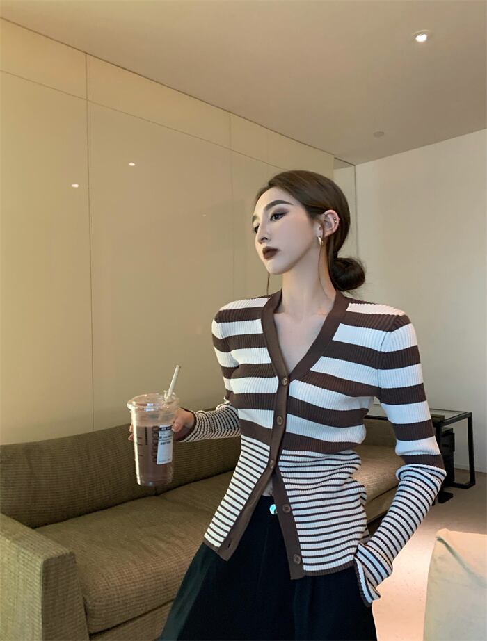 スタンダードカラーストライプニットセーター レディースオータムカジュアルカーディガンシャツ ロング レトロ 秋物 YY-ファッション561533197