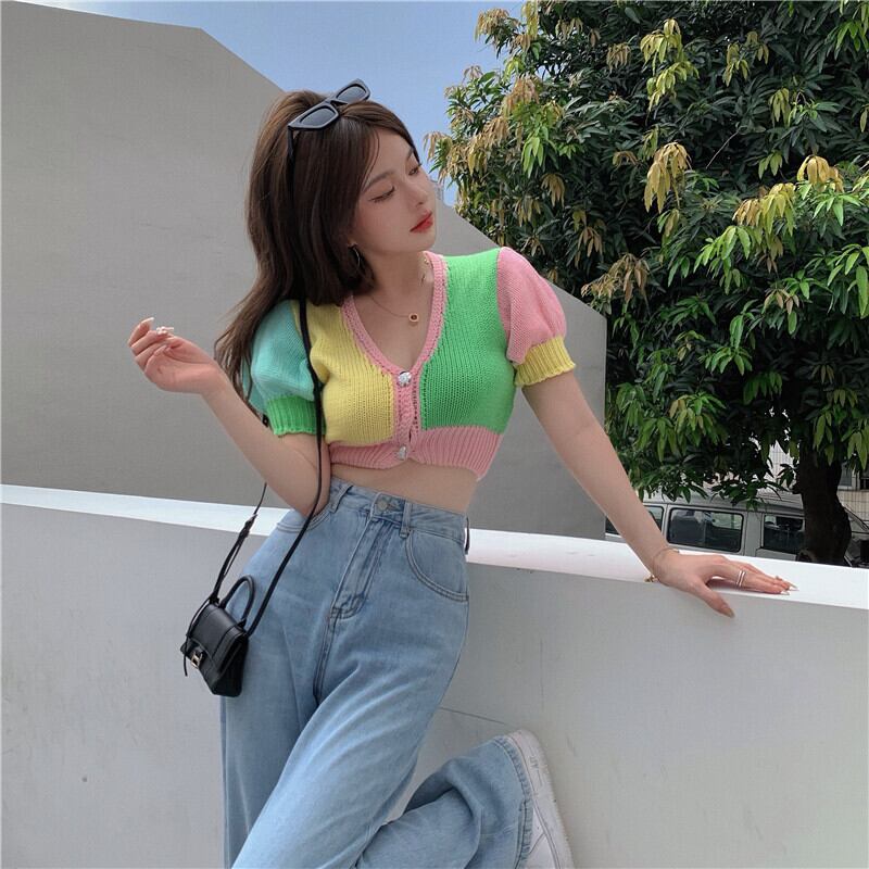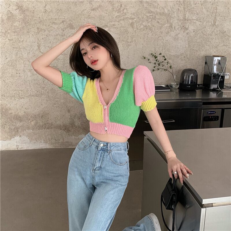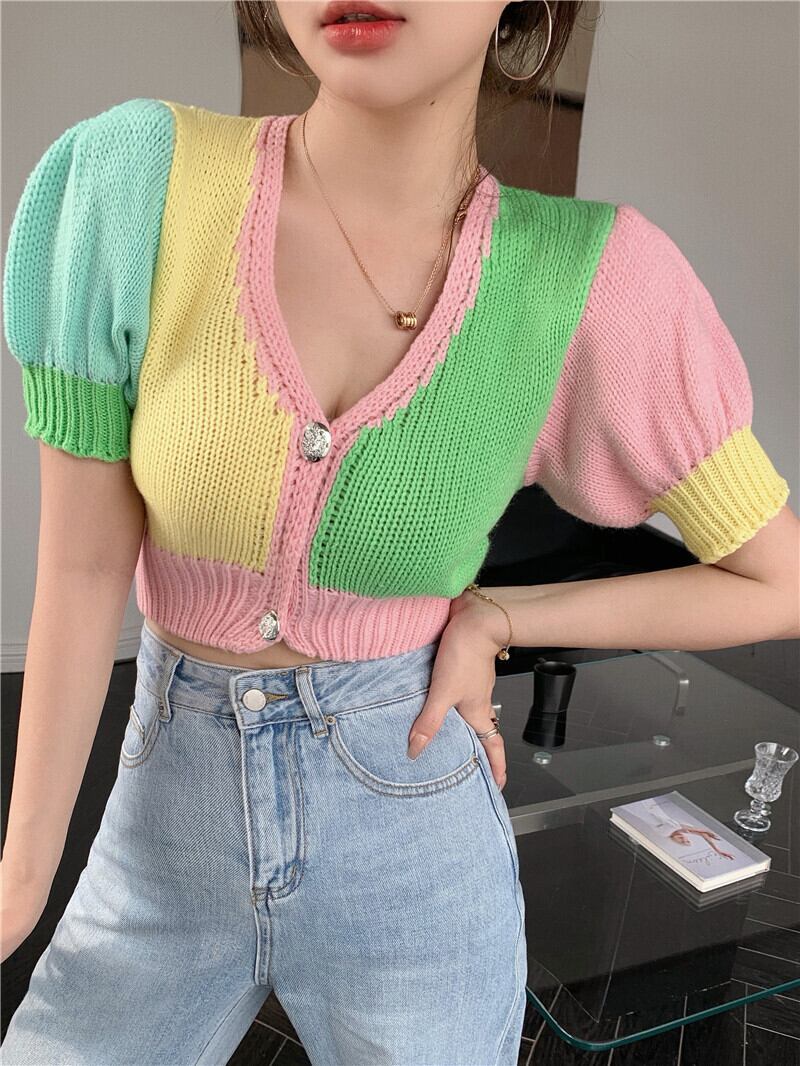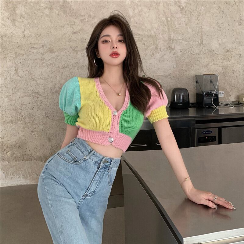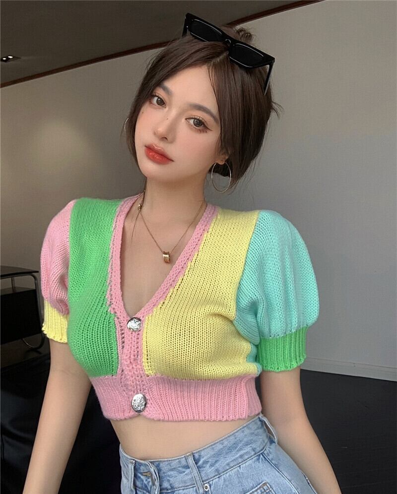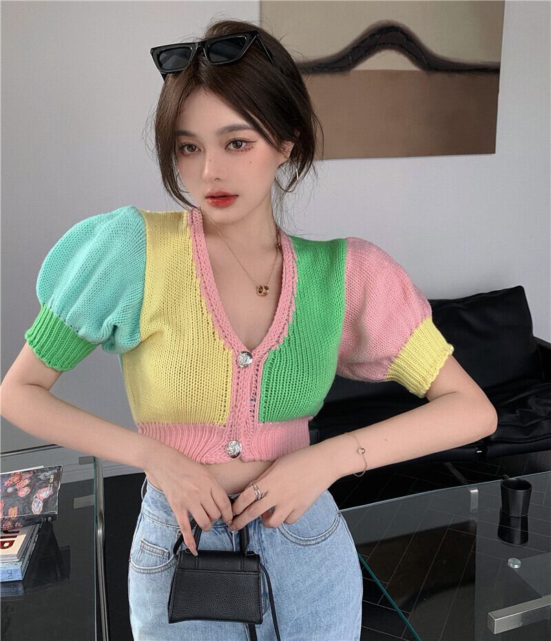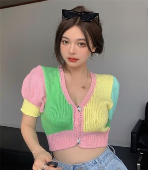 オータムスタイルVネックボタンカラースリーブニットカーディガンショート半袖クロップドTシャツ トップス ハーフスリーブ 秋物 YY-ファッション37949628990
