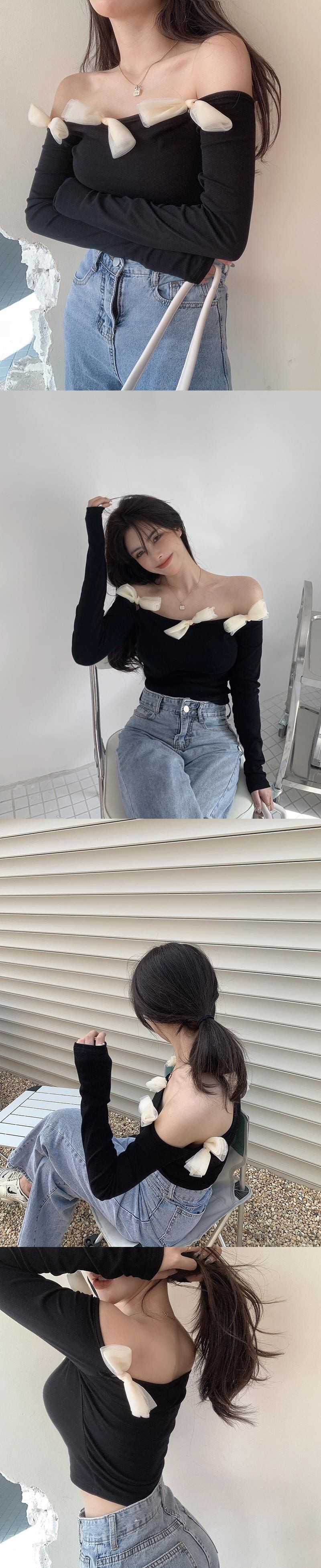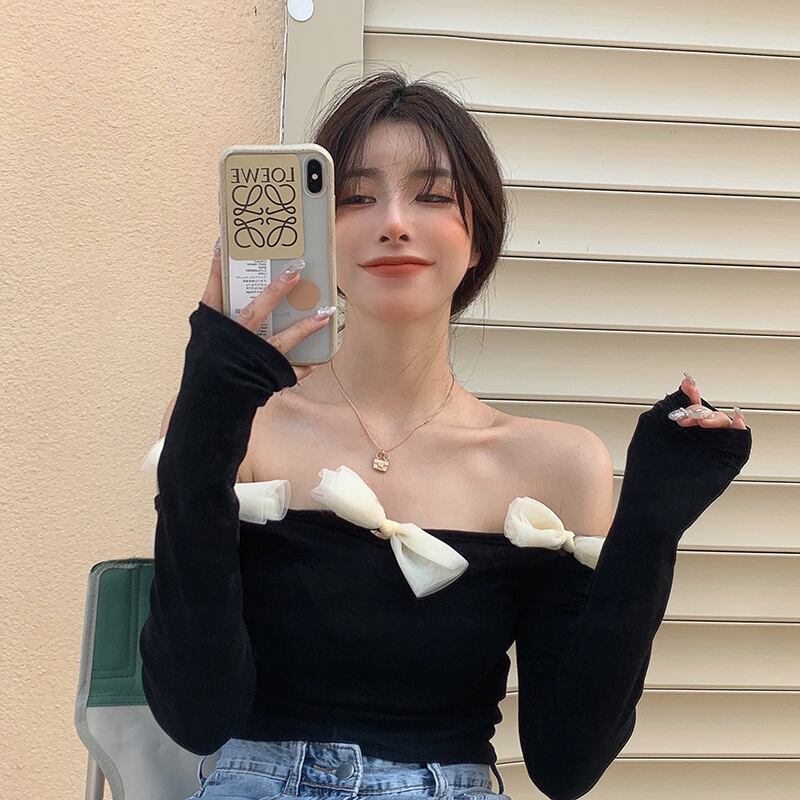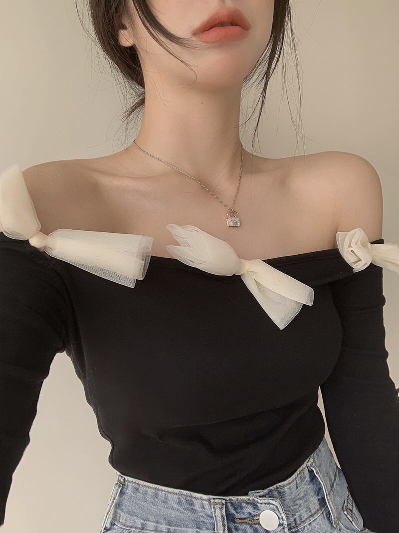 Tシャツ シャツ ショートブラックオータムトップス ロング リボン 秋物 YY-ファッション48443745649