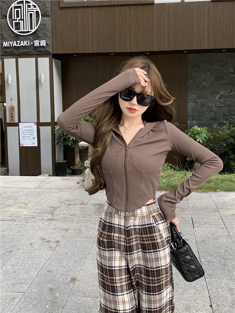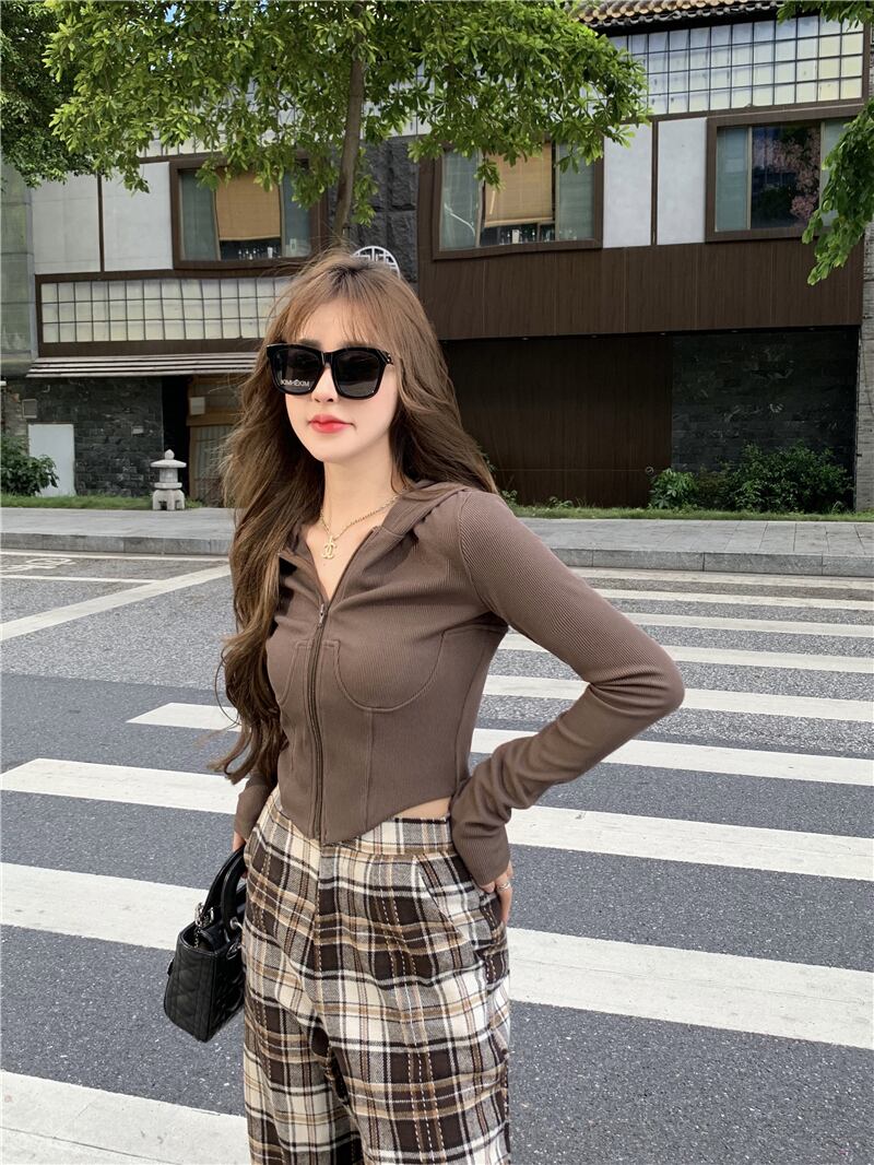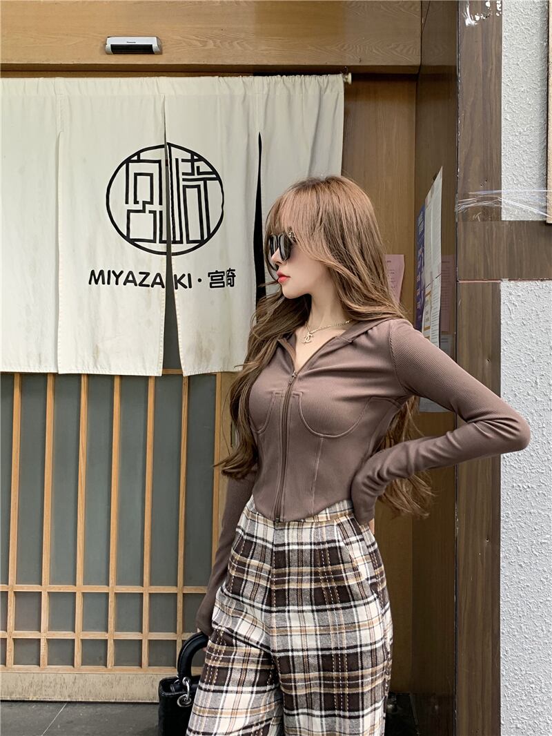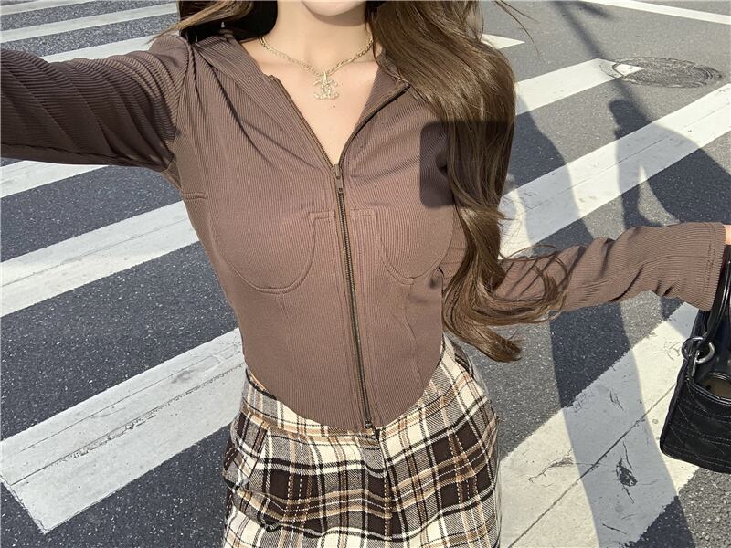 スリムショートフードジッパーカーディガンセーター レディースオータムトップス コート 秋物 YY-ファッション9303267216