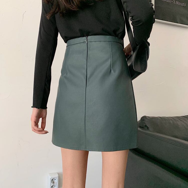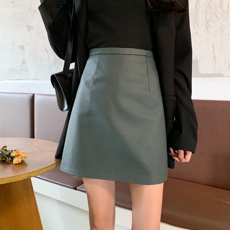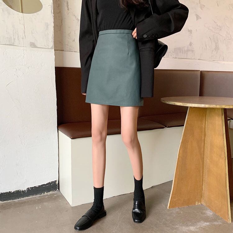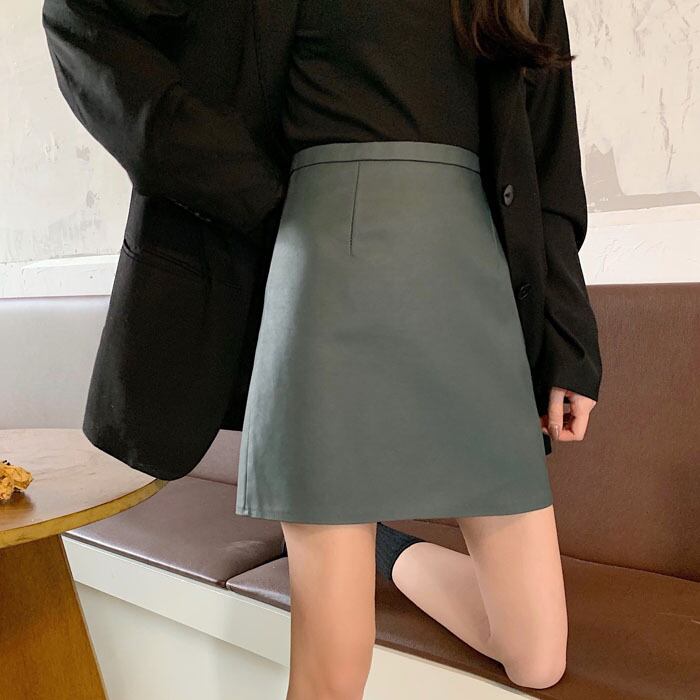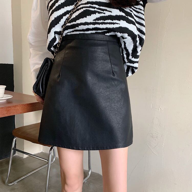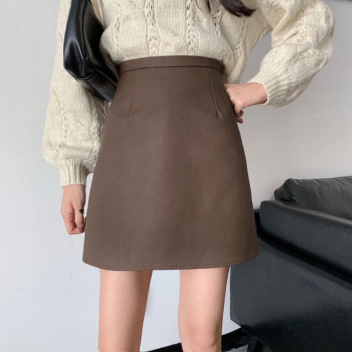 ハイウェストウェスト薄手レザーAラインスカート オータムカジュアルショート 秋物 YY-ファッション73047712999