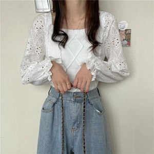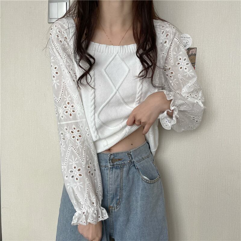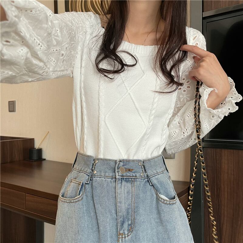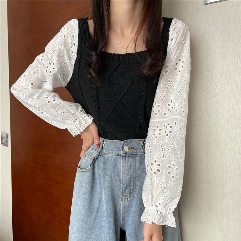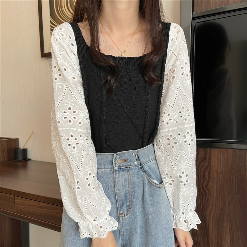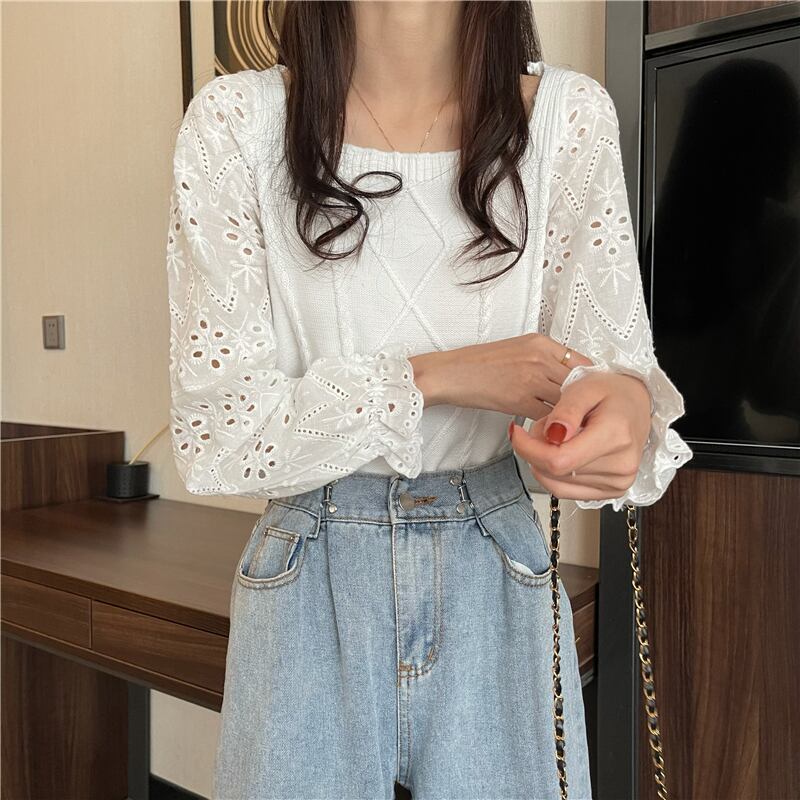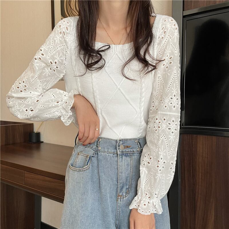 オータムスリムニット刺繍スリーブシャツ トップス 秋物 スクウェア ステッチ YY-ファッション97208055945