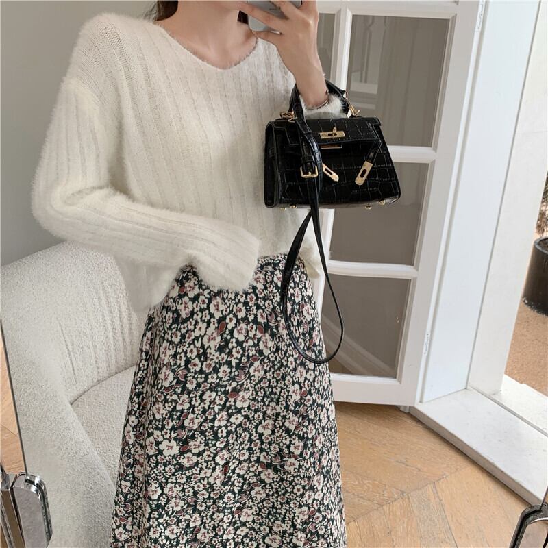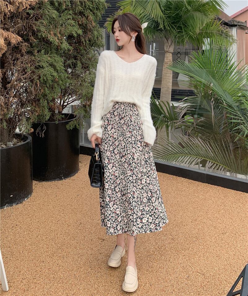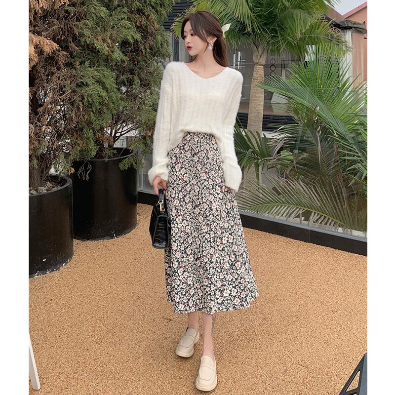 色:白いセーター,グレーのセーター,ブラックフローラルスカート,緑の花のスカート